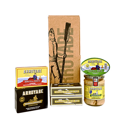 Esta caja regalo incluye las conservas más exquisitas de los pescados que se intercambiaban en esa ruta: ventresca de bonito del norte, lomos de bonito del norte y anchoas en salazón. (primera opción en la tabla de abajo)